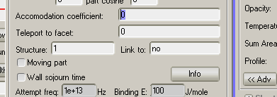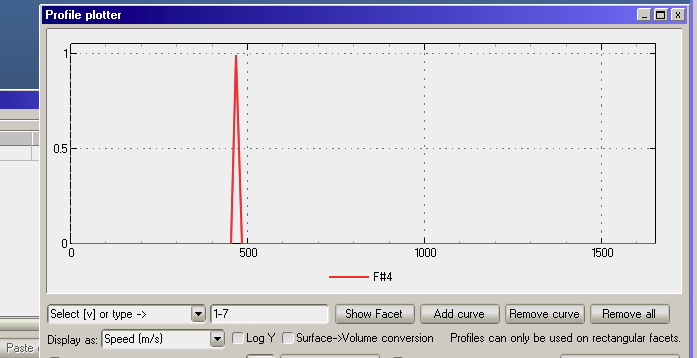 I assume that in your screenshot, facet 232 (the one that’s plotting) has its temperature still as the default value (edge of graph is ~1700m/s), and it’s measuring slow particles, that are bouncing ones. I think disabling the accomodation (setting acc. factor to 0 on all facets) would make that peak at 470m/s disappear, and then increasing the measuring facet’s temp to 3000K would make the graph measure correctly again.