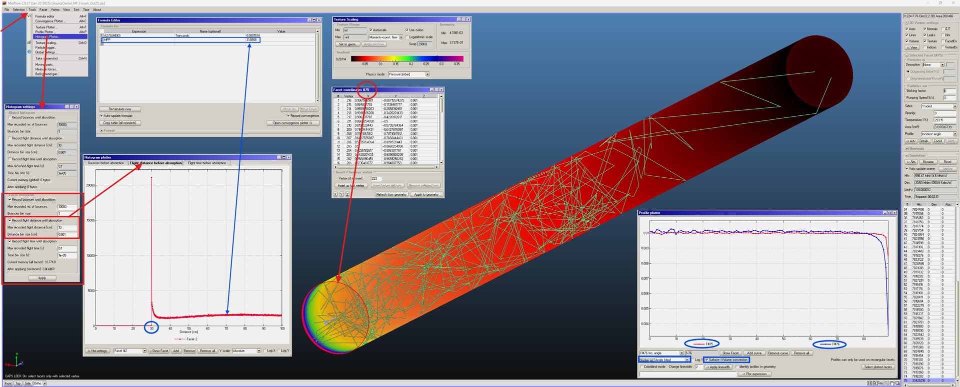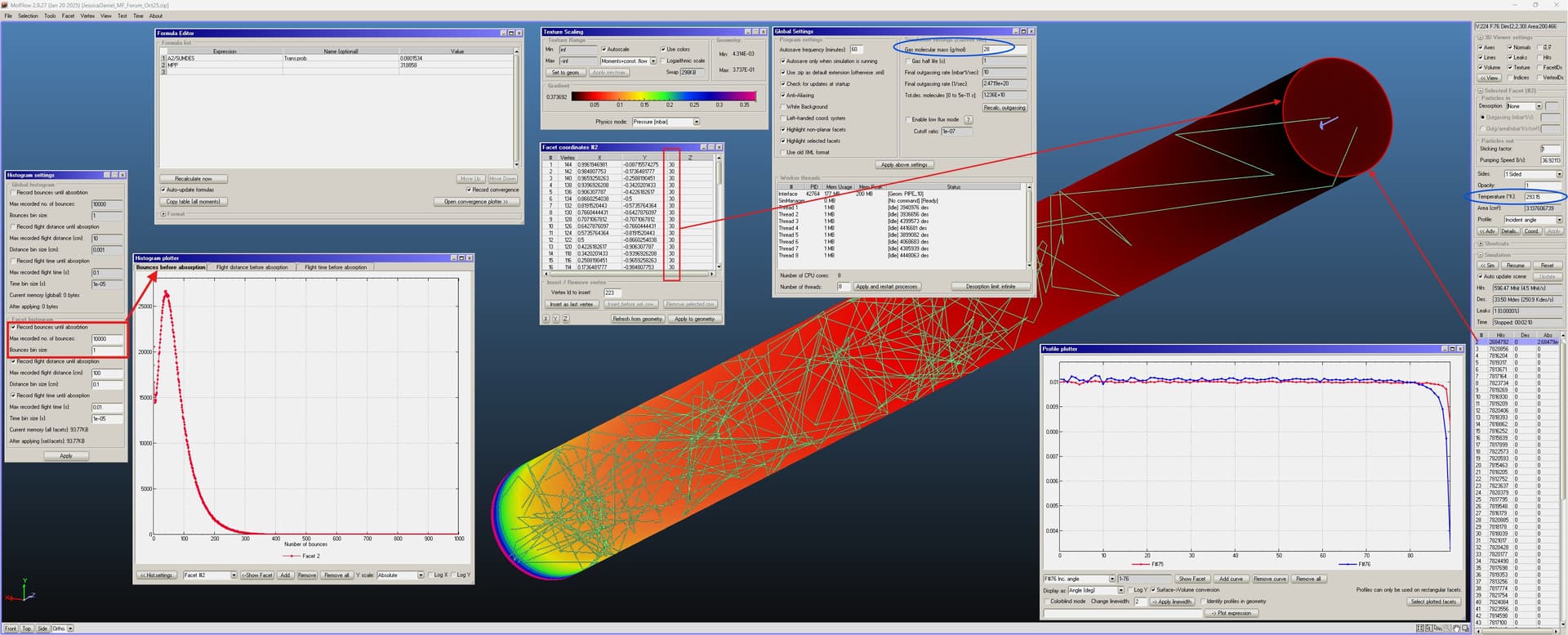 I’ve created a 1 cm radius pipe with 72 side facets, and length adjusted to 30 cm so as to match you datum of a 8% transmission probability, with uniform desorption (from facet 1, the circle on the bottom left in the screenshots) and also uniform reflection along the side walls. The exit facet no.2, circle on the upper right, has sticking =1 like the inlet facet no.1.